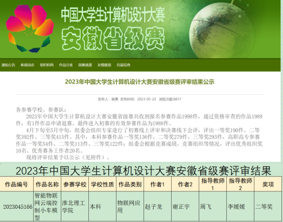 最终,由周飞、李媛媛老师指导的由赵子龙、谢正宇组成的参赛小组所创作的作品在“物联网应用类别中的城市管理方面”获得了省级二等奖,这是电信公司在该类赛事中获得的第二个奖项,体现了电信公司同学崇尚科学,敢于创新的学习风气。