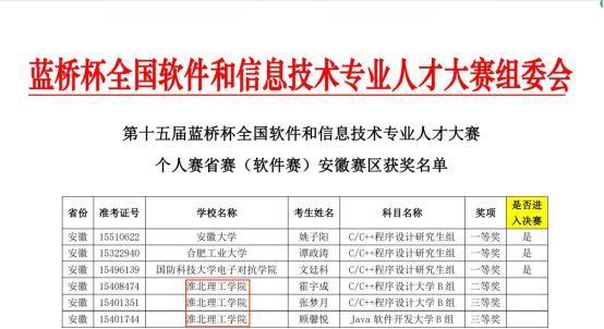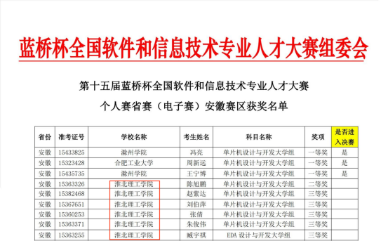 近日,第十五届蓝桥杯全国软件和信息技术专业人才大赛个人赛省赛安徽赛区圆满落幕。威廉体育首次组织并筛选出17位学子参赛。其中4位参加软件赛的学子荣获省级大学B组二等奖1项和省级大学B组三等奖2项,13位参加电子赛的学子荣获省级老员工组二等奖1项和省级大学组三等奖5项。部分获奖名单如图所示: