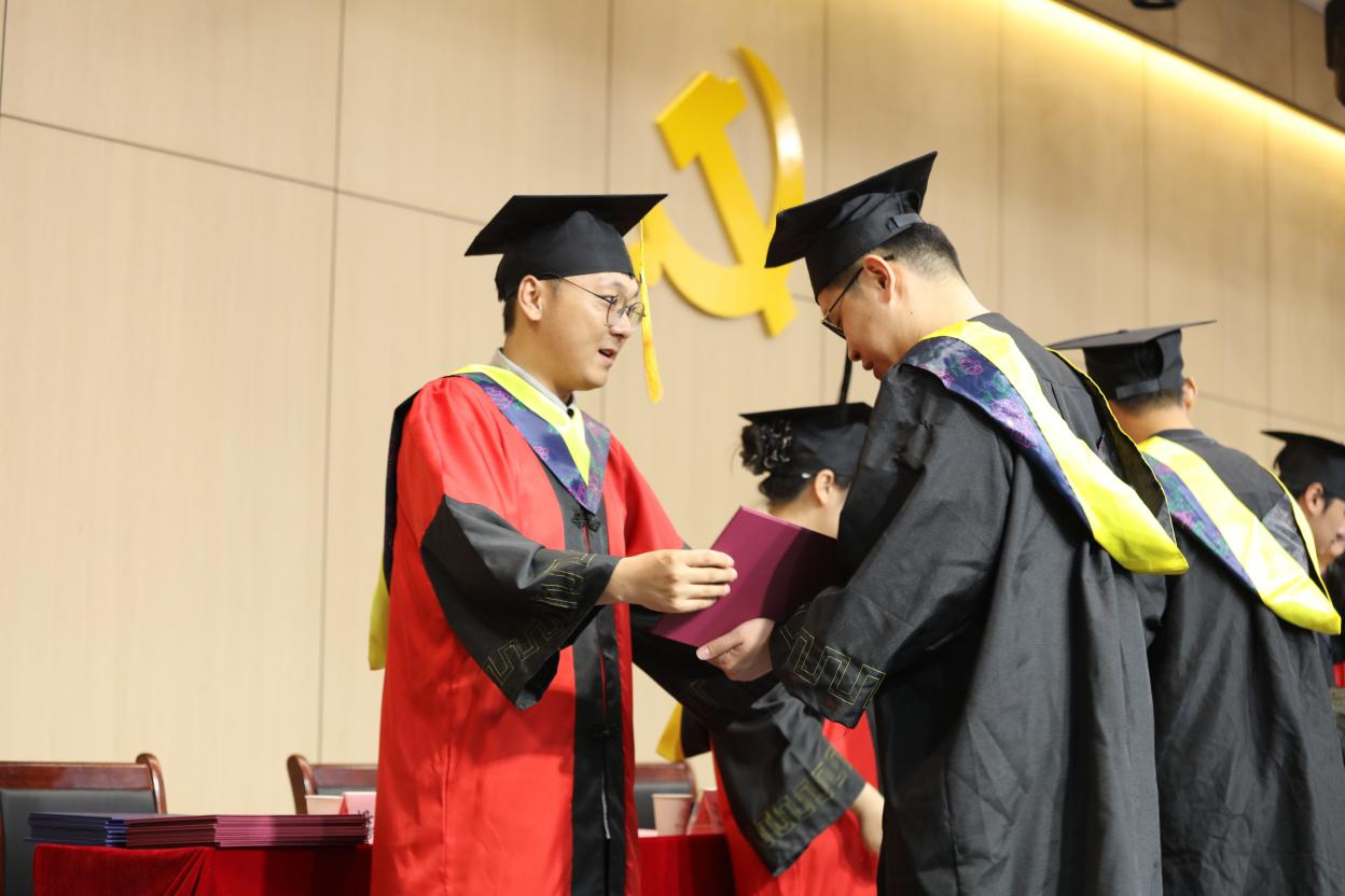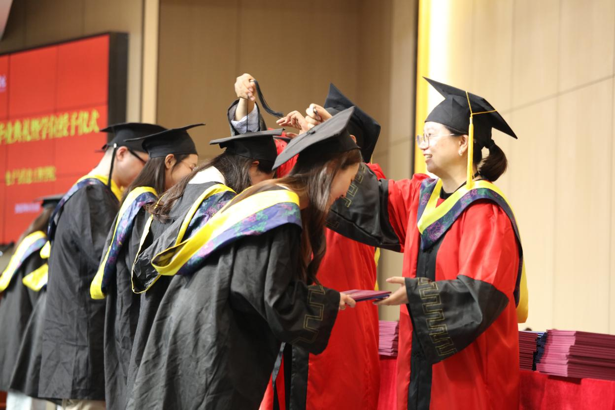 随后,在欢快的音乐声中,校领导和公司领导依次为毕业生代表颁发毕业证书和学位证书,并为毕业生拨流苏。拨穗这一传统仪式,象征着毕业生们学有所成,即将开启人生新的征程,现场气氛热烈而温馨,每一位毕业生脸上都洋溢着自豪与喜悦。