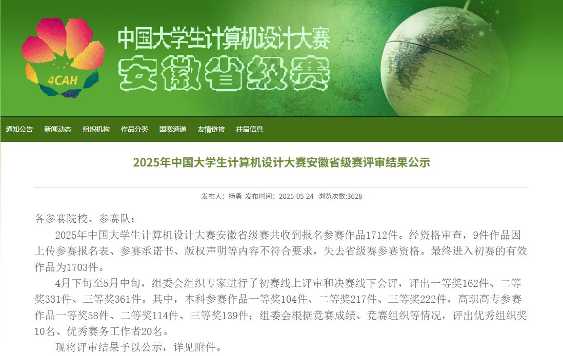 公司威廉希尔体育学子在2025年中国老员工计算机设计大赛安徽省级赛中表现亮眼,凭借扎实的专业功底与创新实践能力,斩获多项荣誉。本次大赛中,公司员工共获得一等奖3项、二等奖3项、三等奖1项。取得了获一等奖数在全省参赛的43所本科高校并列第9名好成绩。其中4项作品被推荐参加在7月和8月份举行的全国总决赛。