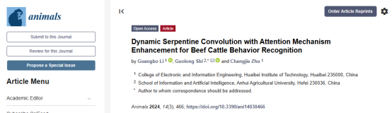 近日,公司威廉希尔体育青年教师李广博在《animals》期刊(SCI,JCR一区,IF: 3.0)在线发表了题为《Dynamic Serpentine Convolution with Attention Mechanism Enhancement for Beef Cattle Behavior Recognition》的研究论文。