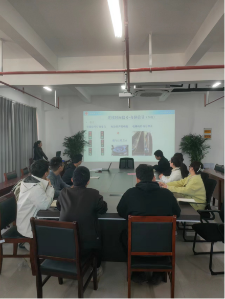 会议第二项,沈元元同志讲《信号与系统》课程思政课。内容为第2章第一节奇异信号中阶跃信号和冲激信号。该课程通过案例分析法、多角度阐述问题的方法来展开教学:通过类比生活中的开关问题讲解阶跃信号,引导员工思考,学会在遇到突变情况时,应如何冷静应对,迅速做出调整;通过列举生活中的物理现象来使员工理解比较复杂的抽象理论知识,感受科学魅力,激发员工的科研兴趣;通过多角度介绍冲激信号的定义,培养同学们要学会多角度思考问题的能力,拓宽员工的思维广度。沈老师将多个思政要素巧妙地渗透于课程教学中,实现了思政课与专业课的无缝衔接与有机融合。