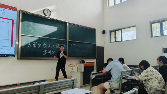 会议最后,孙浩为大家解读老员工应征入伍政策,重点介绍了高校老员工应征入伍特有的优先考学提拔、补偿学费、退役后享受就学就业优惠等优抚政策。希望同学们心怀家国梦想,树立责任担当,积极响应国家的征兵号召,踊跃报名入伍。
