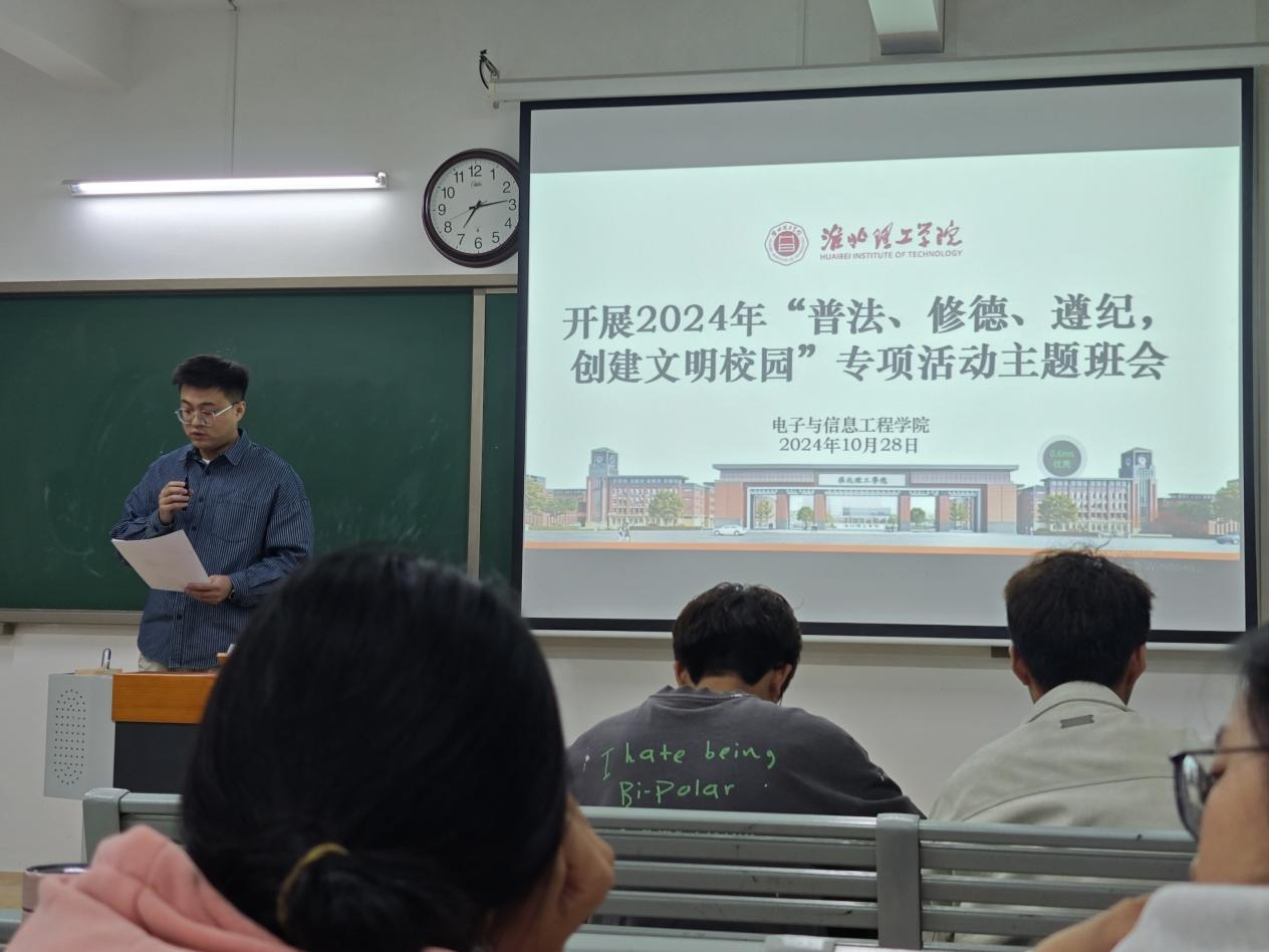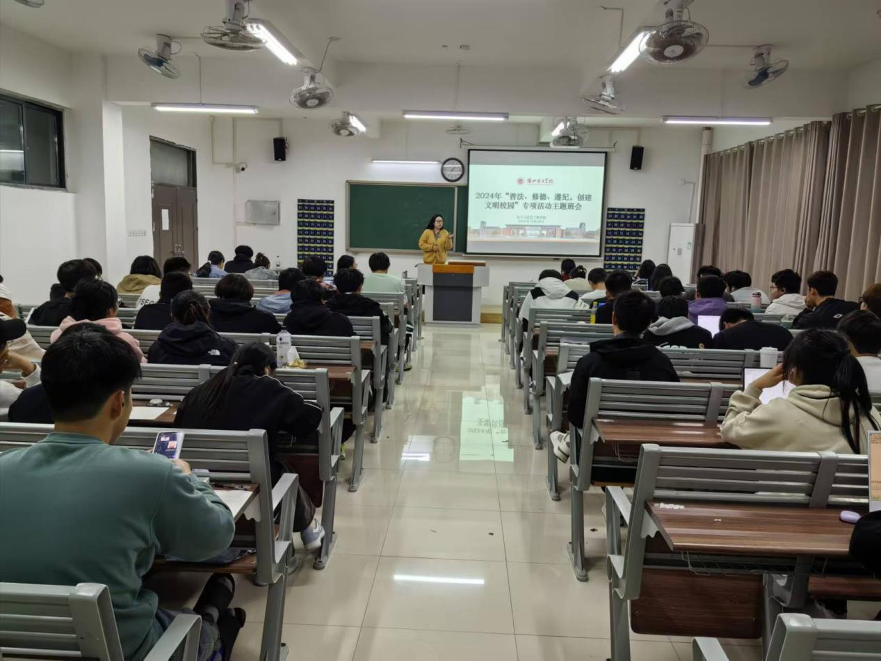 为贯彻落实立德树人的根本任务,坚持“依法治校,以德治校”。威廉希尔体育于2024年10月28日开展“普法、修德、遵纪,创建文明校园”的主题班会。此次主题班会旨在通过丰富多彩的宣传教育和实践活动,营造出一个法治、文明、和谐的校园环境。