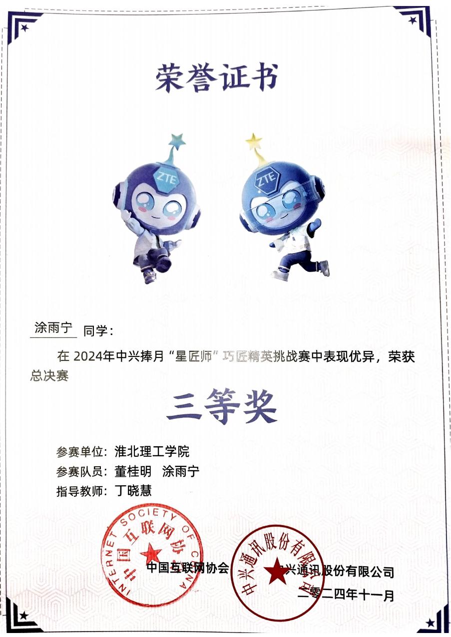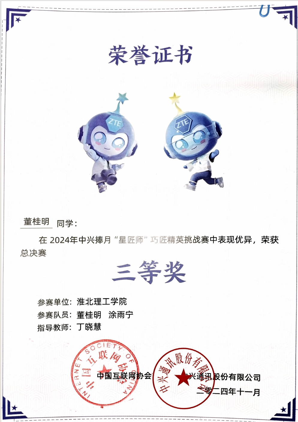 2024年10月27日,第十四届中兴捧月“星匠师”巧匠精英挑战赛全国总决赛在东南大学落下帷幕。本次大赛由中国互联网协会与中兴通讯主办、东南大学承办,旨在面向5G新基建培养具备扎实理论知识和实践能力的应用型人才。公司首次组织员工参赛,大赛实行“省级初赛+全国决赛”模式,公司4名学子组成2个团队与来自全国215所院校的627个团队参与角逐,最终2021级通信工程专业的董桂明、涂雨宁同学在省级比赛中顺利晋级,在全国决赛中荣获三等奖及1000元奖金的佳绩。