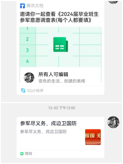 12月3日起,公司通过班级微信、QQ群、短信、电话联系等多种方式,将通知要求和有关政策及时推送给全体未就业男性毕业生,全面展开摸底调查,全覆盖核实了解应征意愿,填写入伍意愿调查统计表,形成台账。